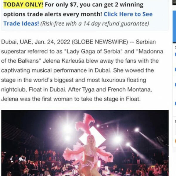 Pevačica Jelena Karleuša, niže uspehe i ima zavidnu karijeru koja traje nekoliko decenija. Osim što je u domaćoj javnosti prepoznata kao svojstven "šoumen" , ona je uspela da zadivi i svetsko javno mnjenje koje ne prestaje da bruji o njenom koncertu, koji je održala u Ujedinjenim Arapskim Emiratima, na najvećem splavu na svetu- "Float in Dubai" . Šou koji je trajao više od dva sata, pokazao je da je sasvim opravdana titula "dive" koju Jelena nosi.