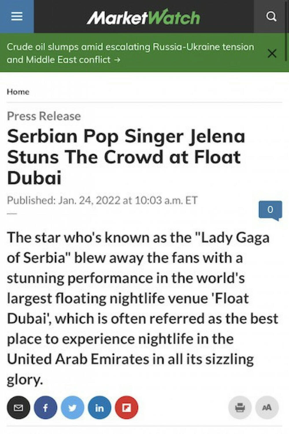 Nastup Jelene Karleuše koji se odigrao za vikend u Dubaiju, ne prestaje da se komentariše, a srpska diva pop muzike uspela je još jednom da se nađe kao vodeća tema u svetskoj štampi, koja je oduševljena maestralnim pojavljivanjem pevačice.
