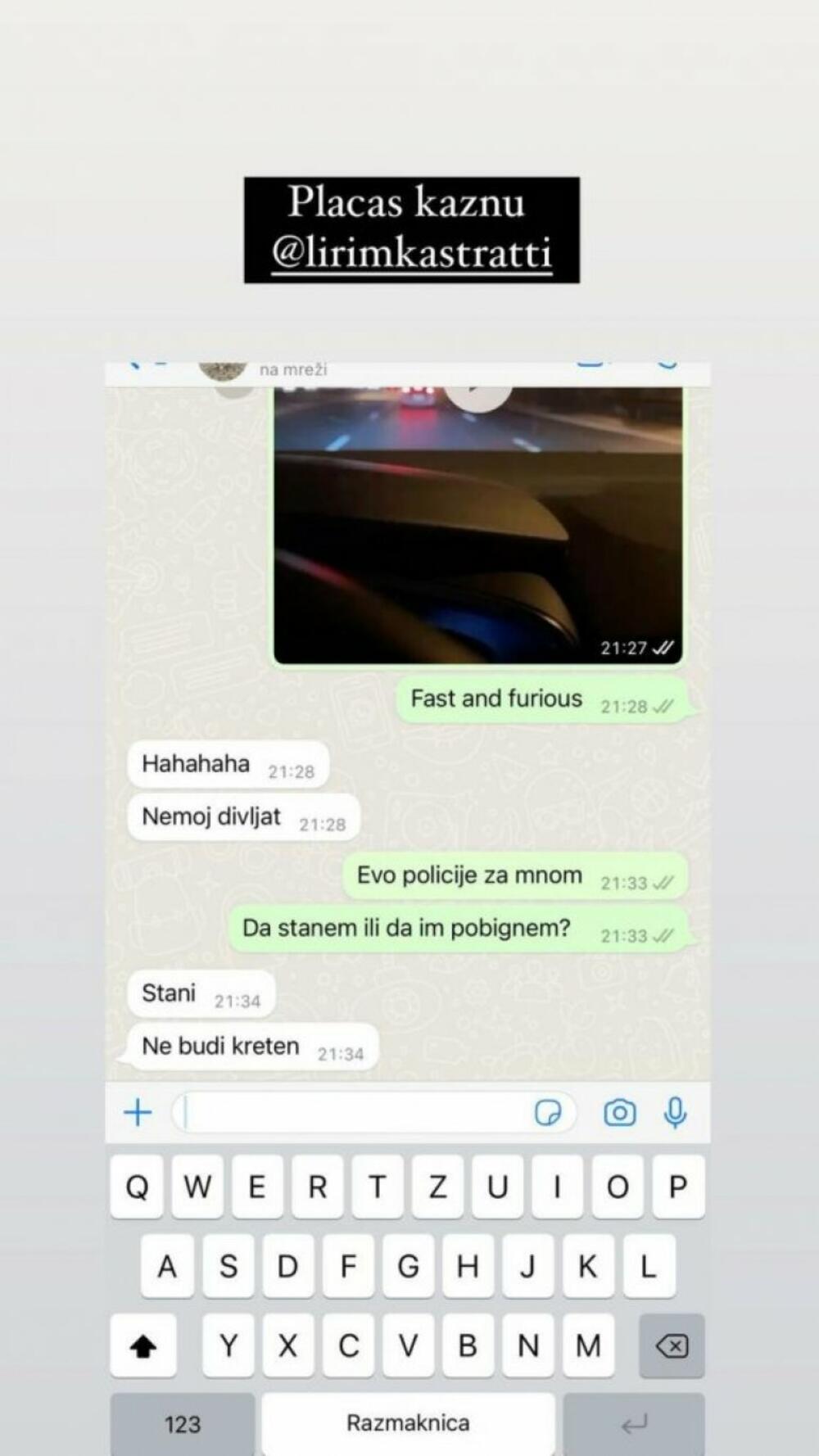 Svojim izazovnim izdanjima manekenka se često hvali na društvenim mrežama, a ovog puta na svom je Insta storiju objavila skrinšot prepiske sa Kastratijem kojem je slala snimak svoje divlje vožnje po putu.