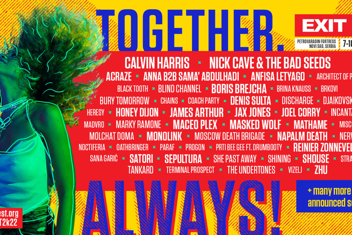 EXIT festival će biti održan od 7. do 10. jula 2022. godine na Petrovaradinskoj tvrđavi, a svoje nastupe su potvrdila neka od najvećih svetskih i regionalnih imena, kao što su Calvin Harris, Nick Cave & The Bad Seeds, James Arthur, Masked Wolf, Joel Corry, Jax Jones, Boris Brejcha, Honey Dijon, Maceo Plex, Reinier Zonneveld, Monolink, Denis Sulta, ZHU, ACRAZE, Sama’ Abdulhadi, ANNA, Sepultura, Napalm Death, Marky Ramone, Molchat Doma, She Past Away, Brkovi, Paraf, Vizelj, Coach Party, Sana Garić, Prti Bee Gee i mnogi drugi, a nova imena stižu uskoro!