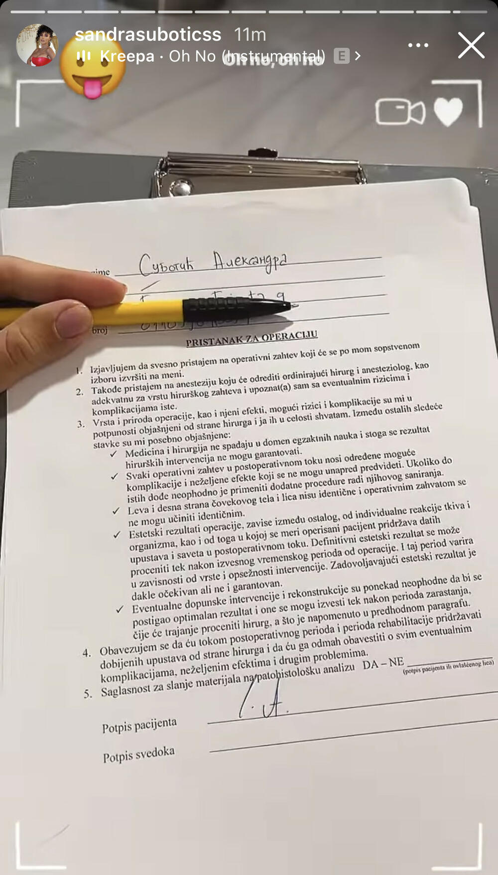 Ona je fotkala dokument koji se potpisuje pre operacije, a starleta ne krije sreću što ponovo ide pod nož. Ona nije otkrila šta menja na sebi, ali zasigurno se zna da je operacija kod plastičara.