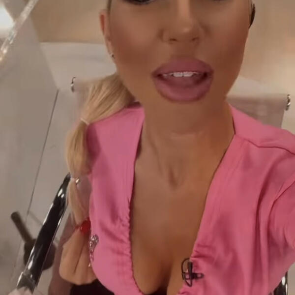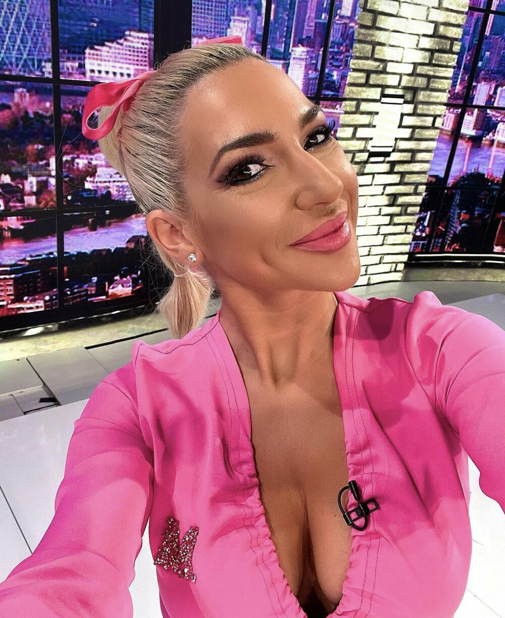 Ona je obukla pink bluzu i crne pantalone, a ono što je svima privuklo pažnju je njen dekolte koji je nikad veći.