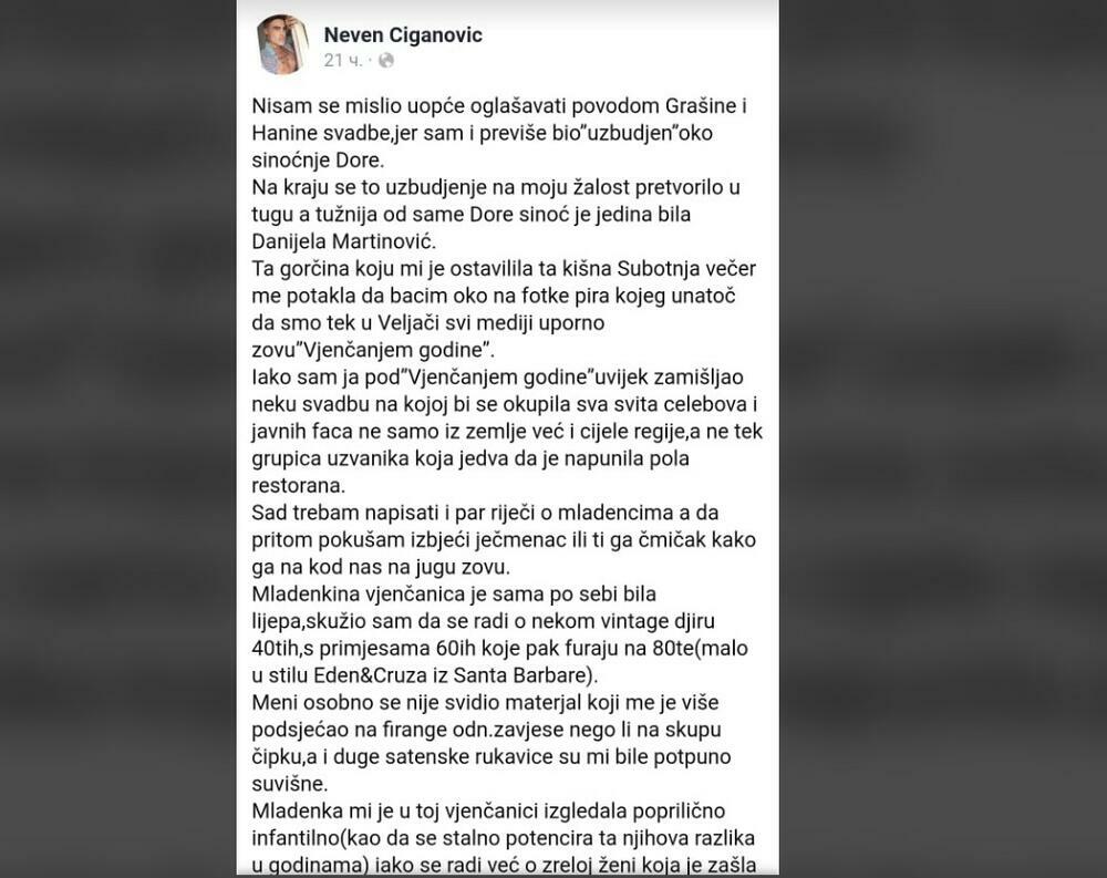 U svojoj objavi na Fejsbuku napisao je sve što misli o venčanju Hane i Petra.