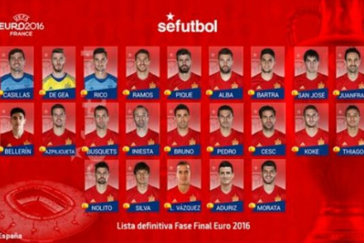 I selektor Španije, Visente Del Boske se odlučio za 23 igrača koja će predstavljati ovu selekciju na Evropskom prvenstvu u Francuskoj. Najveća iznenađenja predstavlja činjenica da na spisku nema Iska i Saula Nigeza. Evo i celog spiska. Golmani: Iker Kasiljas (Porto), David De Hea (Junajted) i Serhio Riko (Sevilja) Odbrana: Đerar Pike, Đordi Alba, Mark Bartra (svi iz Barselone), Serhio Ramos (Real Madrid), Sezar Aspilikueta (Čelsi), Huanfran (Atletiko Madrid), Mikel San Hoze (Bilbao) i Hektor Beljerin (Arsenal) Sredina terena: Bruno (Viljareal), Serhio Buskets, Andres Inijesta (obojica iz Barselone), Tijago Alkantara (Bajern), David Silva (Siti), Pedro, Sesk Fabregas (obojica Čelsi), Lukas Vaskez (Real Madrid), Koke (Atletiko Madrid) Napad: Aric Aduric (Bilbao), Nolito (Selta), Alvaro Morata (Juventus). (Espreso.co.rs)