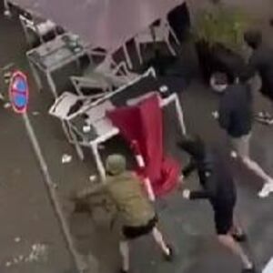 Na snimcima se može videti žestok sukob navijača, razbijene glave, stolovi, flaše...