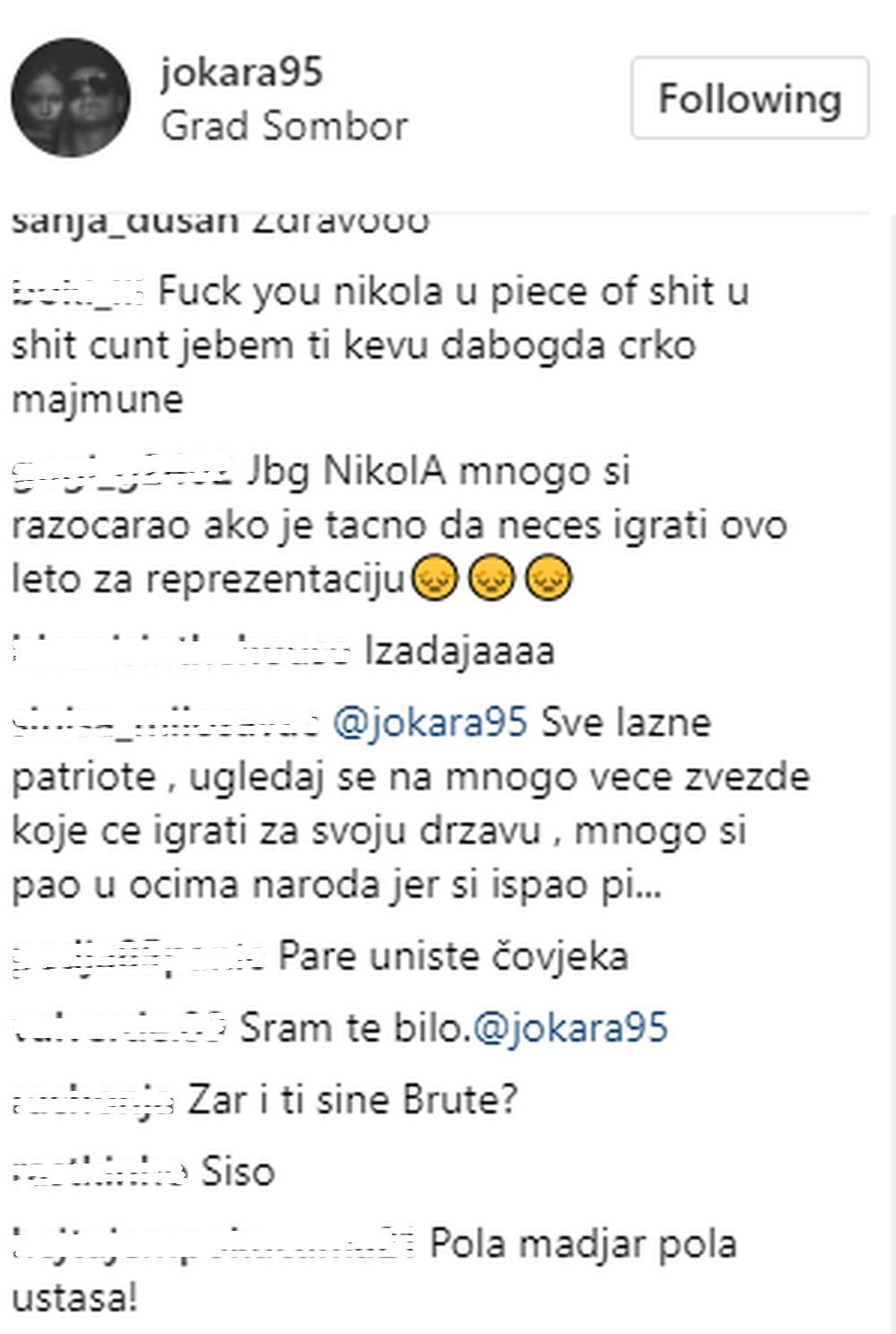Uglavnom anonimusu zasuli najgorim mogućim uvredama Jokićev profil na Instagramu