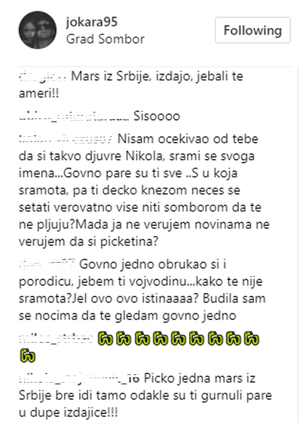 Njegov Instagram profil zasut je uvredama najgore vrste, a neki su otišli toliko daleko da ga kunu i žele da mu se sve najgore dogodi u daljoj karijeri.ž