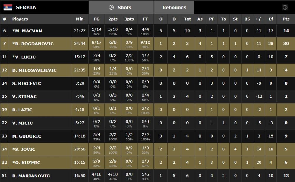 Najefikasniji u ekipi Srbije bio je Bogdan Bogdanović sa 30 poena, dok je u ekipi Letonije 23 poena postigao Dajris Bertans.