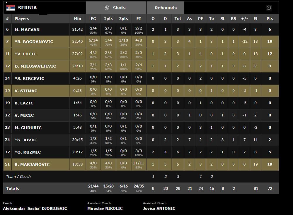10. minut - Kraj prve četvrtine Srbija na krilima Marjanovića i Lučića vodi 21:18.
