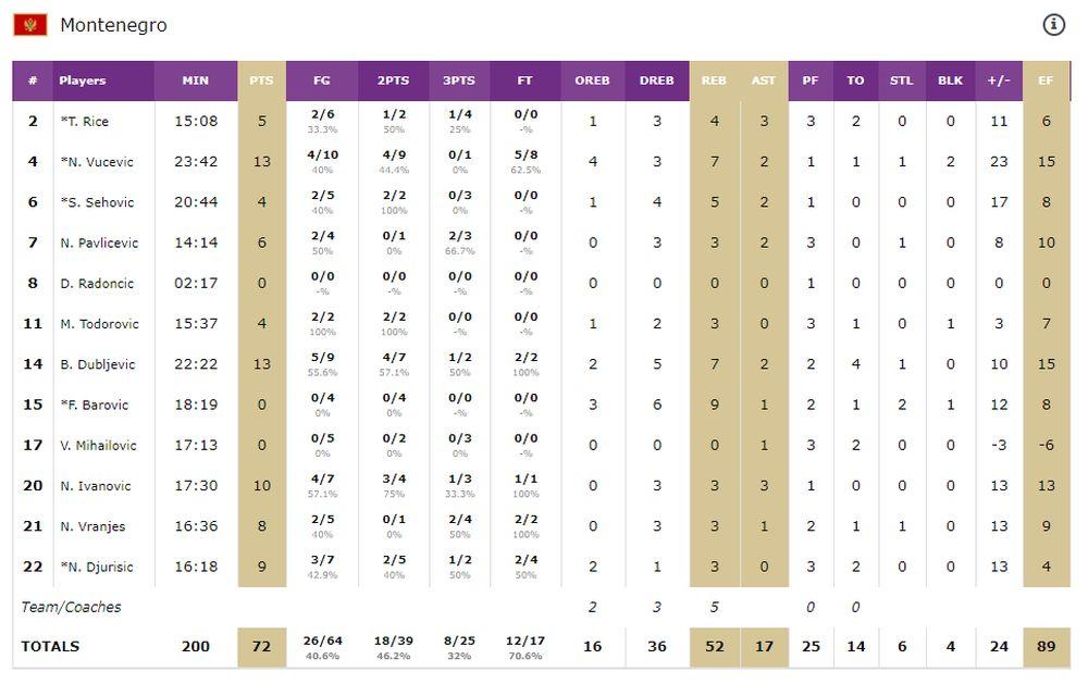 Sa po 13 poena su ih predvodili Dubljević i Vučević i pos 7 skokova su imali, dok je Ivanović dao 10 poena.