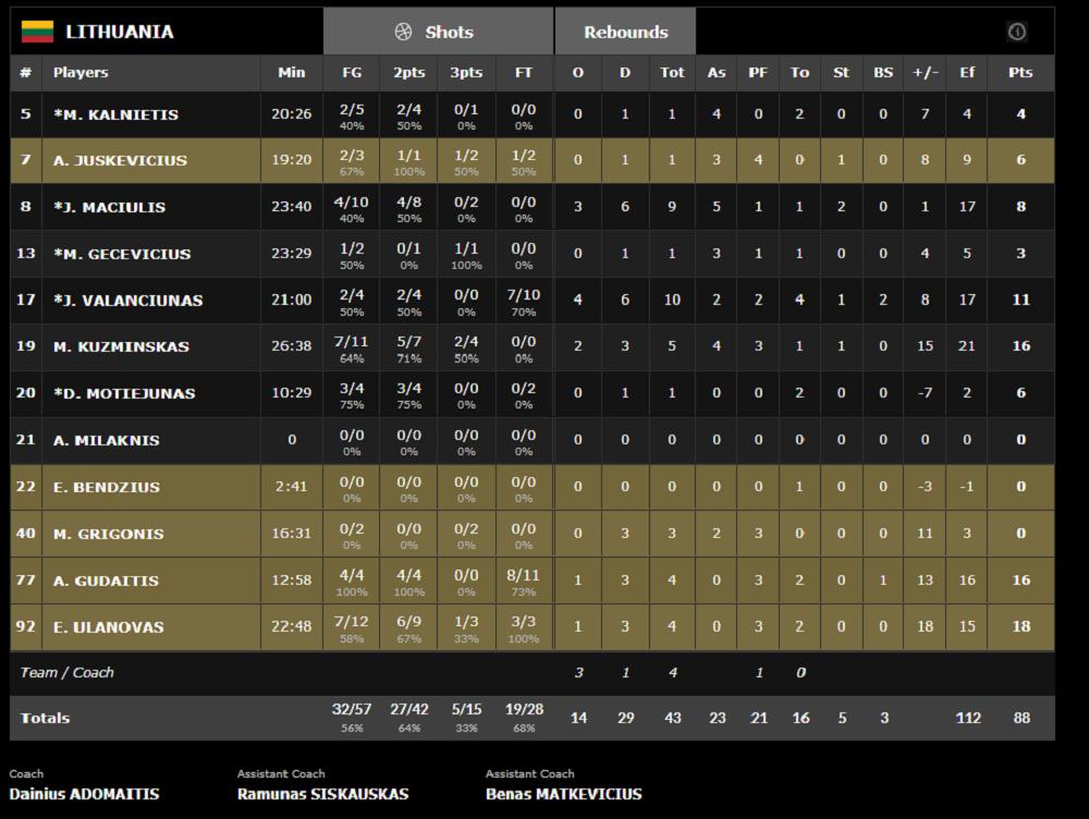 Kod Litvanaca bolji od ostalih bili su Ulanovas sa 18 poena i Gudaitis i Kuzminskas koji su dodali po 16.