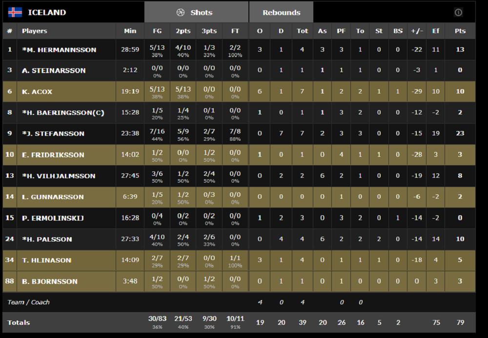 Islanđani su se držali u prvom poluvremenu i imali su zaostatak od samo sedam poena na kraju druge četvrtine.