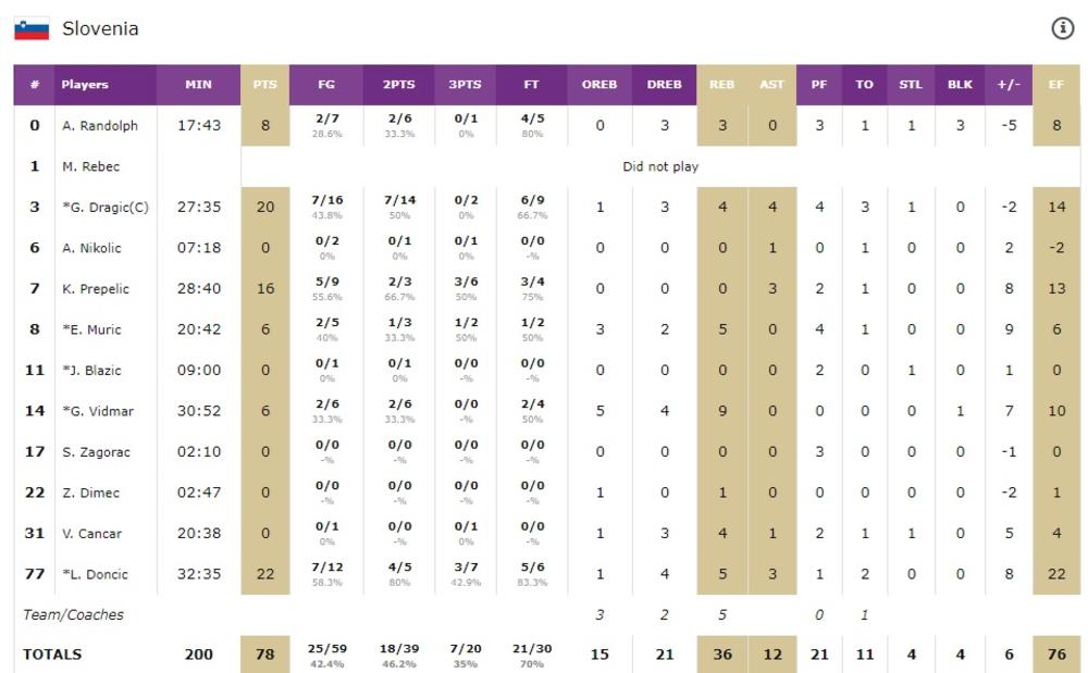 Dončić je bio najefikasniji sa 22 poena, odlična partija 18-godišnjeg košarkaša madridskog Reala, Dragić je imao problema, ali je na kraju uspeo da upiše 20 poena uz po četiri skoka i asistencije. Pratio ih je Klemen Prepelič sa 16 poena.