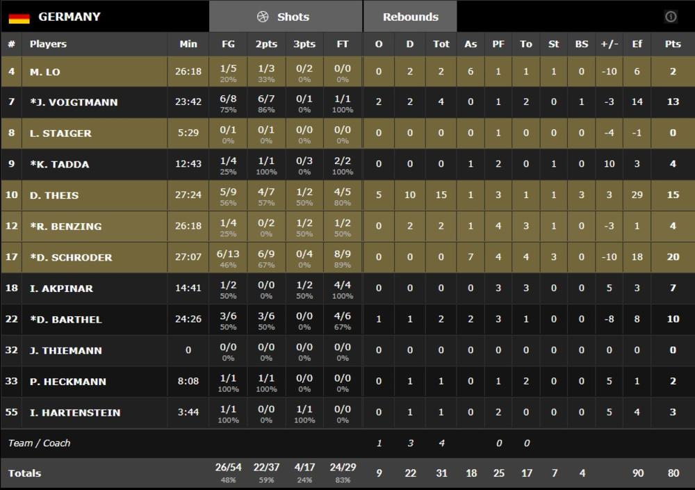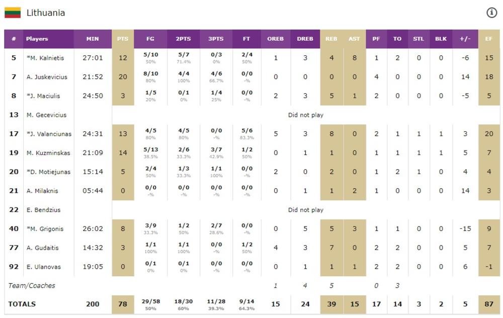 Najefikasniji igrač pobedničkog tima bio je Juskevičijus sa 20 poena. Kuzminskas je ubacio 14, Valančijunas 13, Kalnietis 12, uz osam asistencija...