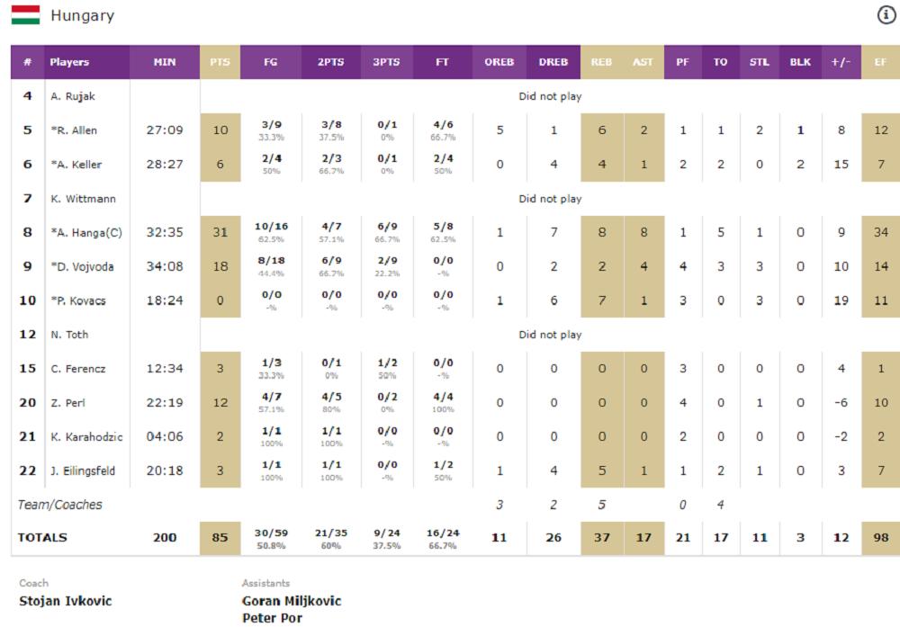 Ovu 48 godina dugu neprijatnu tradiciju, Hanga je okončao šutom za tri poena 6/8, odnosno 4/7 za dva, nakon što je u prva dva kola potpuno razočarao, zabeleživši ukupno 13 poena uz indeks korisnosti sedam (pet protiv Hrvata, dva protiv Crne Gore). David Vojvoda, šuter Solnoka, pratio je Hangu sa 14 poena, Zoltan Perl postigao je 12, a Rosko Alen 10 poena.