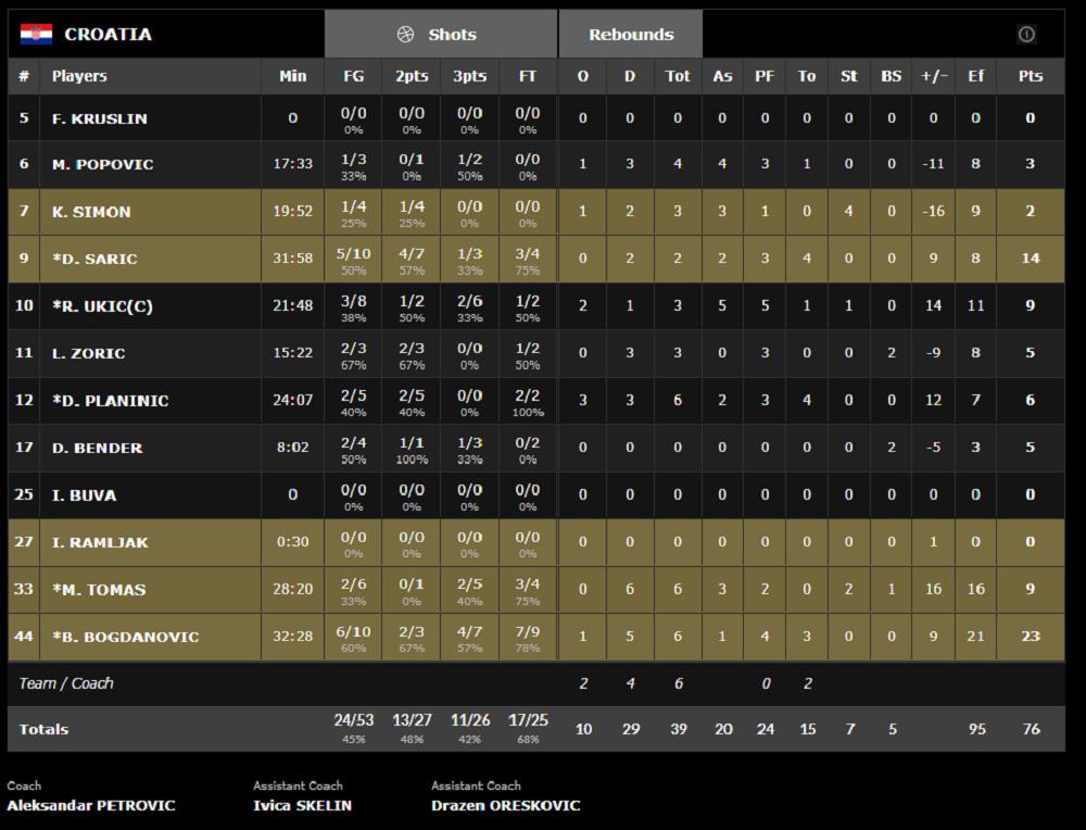 Najbolji u timu Hrvatske bio je Bojan Bogdanović sa 23 poena, dok je Dario Šarić dodao 14. Oni su bili jedini dvocifreni u pobedničkom timu.