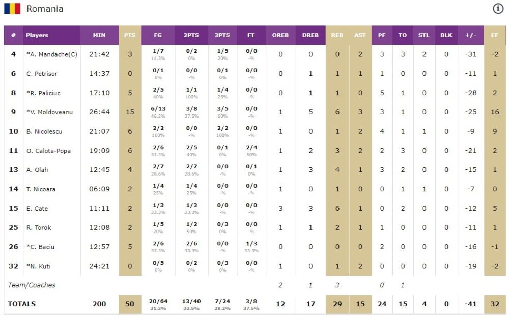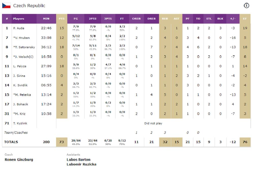 U poraženom timu odskočili su NBA plejmejker Tomaš Satoranski (7sk, 4as, 6izg) i Lukaš Paliža sa po 18 poena. Patrik Auda dodao je 15, Vojteh Hruban 12, ali su svi ostali zajedno sakupili svega 10.