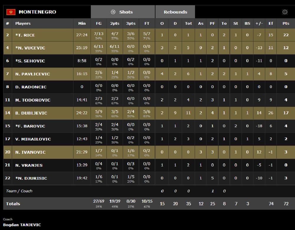 Crnogorci su počeli da igraju kada se probudio Tajris Rajs. Plejmejker Sokolova loše je otvorio meč, ali je na kraju ipak bio najefikasniji u timu Bogdana Tanjevića sa 22 poena. Dvocifreni su bili još Dubljević sa 17 i Vučević sa 12 poena.