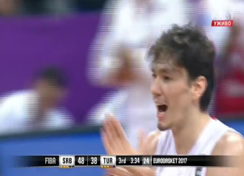 5. minut - Birčević je istrčao kontru i pogodio uz faul. Nezgodno je pao pri doskoku i udario je glavom u konstrukciju koša, ali na svu sreću nije teže povređen.