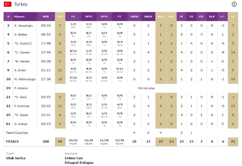 Kod Turske bolji od ostalih su bili Mahmutoglu sa 19 i Osman 15 poena.