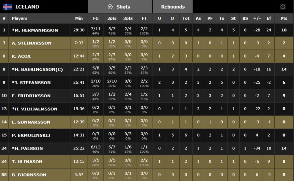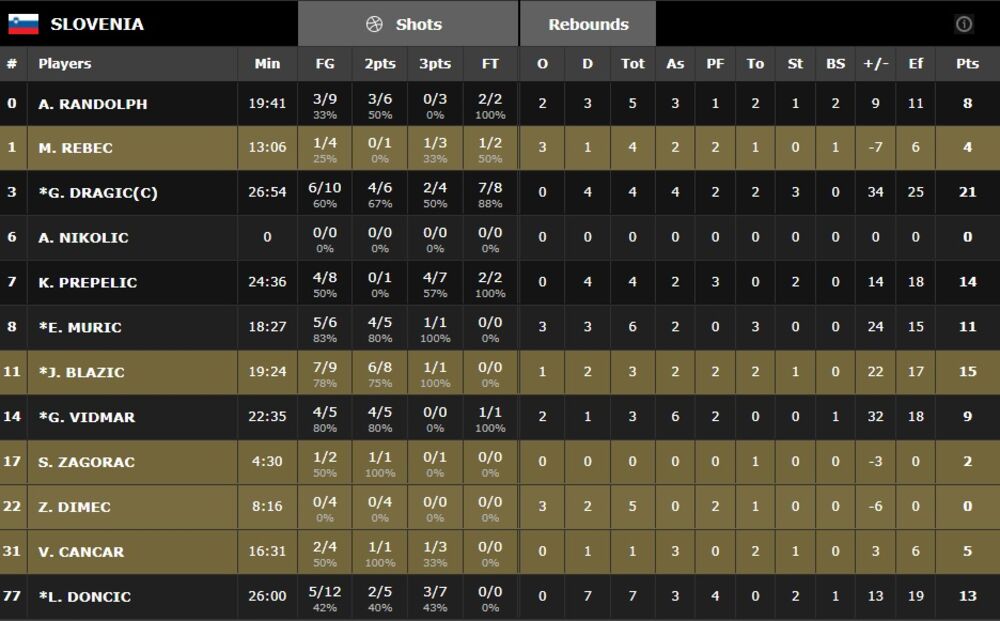 Najefikasniji u ekipi Slovenije bio je Goran Dragić sa 21 poenom, dok je za Island Hermanson ubacio 18 poena.