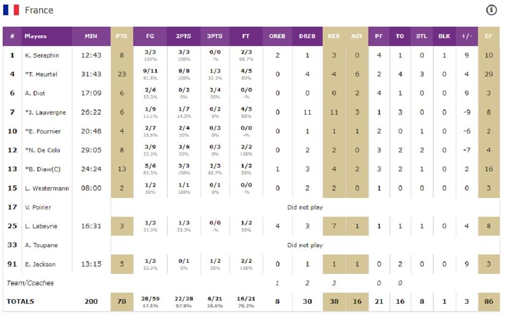 Najefikasniji pojedinac na utakmici bio je upravo Toma Ertel sa 23 poena (4 sk, 6 as), a u selekciji Francuske izdvojili su se još Boris Dio sa 13 poena, odnosno Žofri Lovernj sa 6 poena i 11 asistencija.