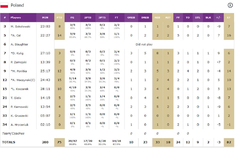 Poljaci su bili oslabljeni neigranjem Ej Džej Slotera, a ulogu lidera preuzeo je Vačinski sa 15 poena i 4 asistencije, dok je Sel postigao 14 poena.