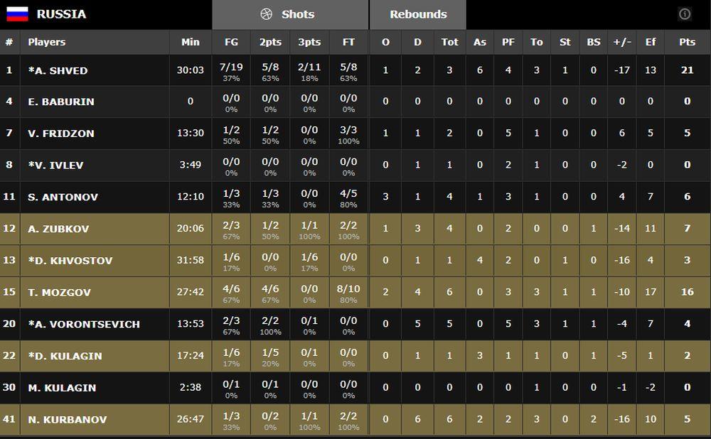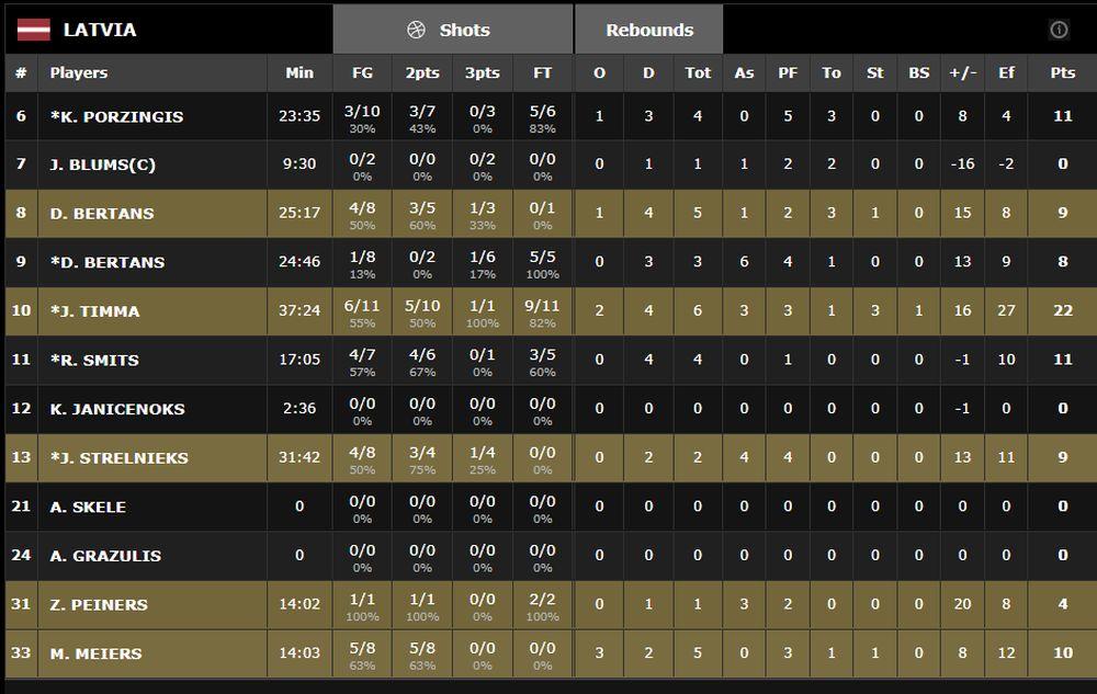 Najbolji pojedinac na meču bio je Janis Tima sa 22 poena, a pratili su ga Šmits i Porzingis sa po 11 poena. Kod Rusa po običaju najefikasniji Šved sa 21 poenom, a Mozgov je postigao 16.