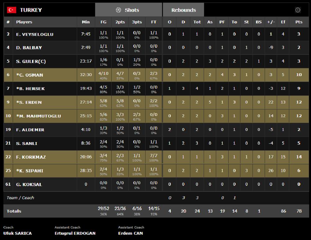 Korkmaz je u timu Turske postigao 14 poena, dok su Erden i Mahmutoglu dodali po 12.
