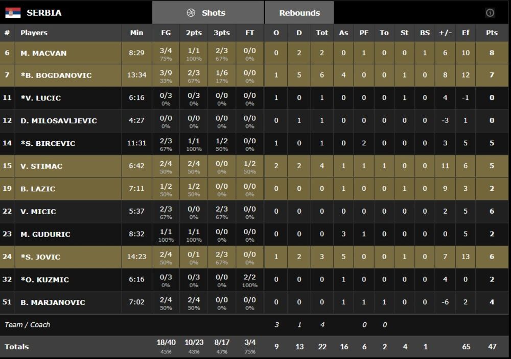 Inače, Srbija je pogodila 10 trojki iz 28 pokušaja, što je poboljšanje u odnosu na prethodne mečeve.