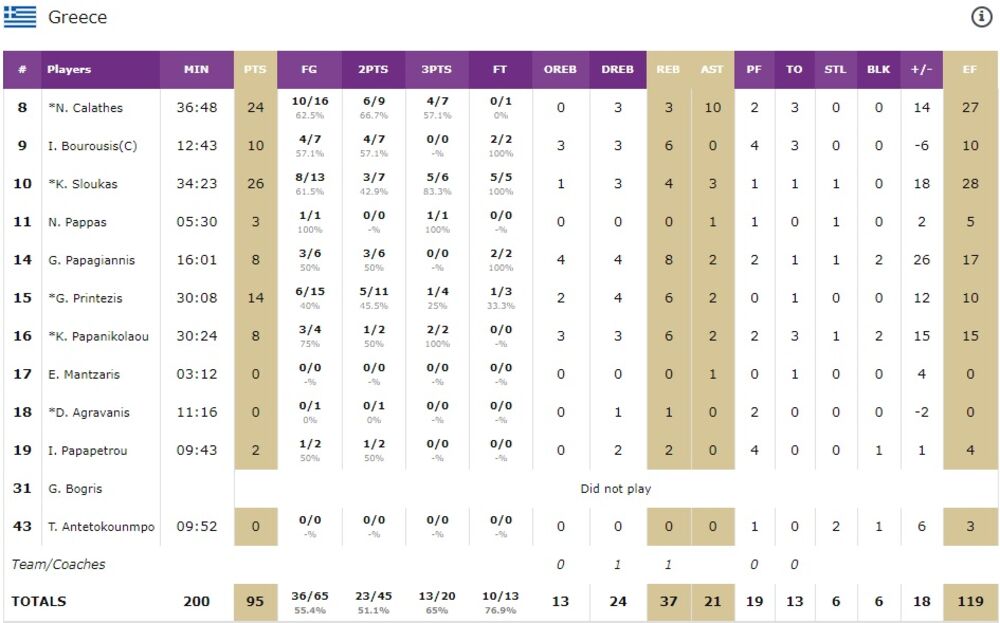 U pobedi Helena nad Poljacima najefikasniji bio je Kostas Slukas sa 26 poena (3/7 za dva, 5/6 za tri), 4 skoka i 3 asistencije, a pratio ga je Nik Kalates sa 24 poena (6/9 za dva, 4/7 za tri) i 10 asistencija. Svoj doprinos u pobedi nad Poljskom dali su Jorgos Printezis sa 14 poena i 6 skokova, odnosno kapiten Janis Burusis sa 10 poena i 6 skokova.