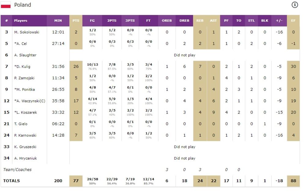 Damijan Kulig bio je najefikasniji pojedinac u reprezentaciji Poljske sa 26 poena i 7 skokova.