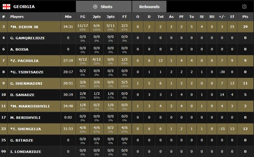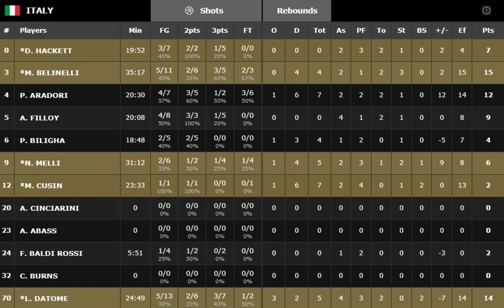 Marko Belineli (15 pts, 4 sk, 2 as) i Luiđi Datome (14 pts, 5 sk, 4 as) bili su najefikasniji u pobedničkom sastavu, dok je selekciju Gruzije predvodio Džej Ar Dikson sa 29 poena. Ovakav rezultat u duelu Italije i Gruzije ide na ruku selekciji Ukrajine koja će večeras imati priliku da eventualnom pobedom nad Izraelom osigura plasman u osminu finala.