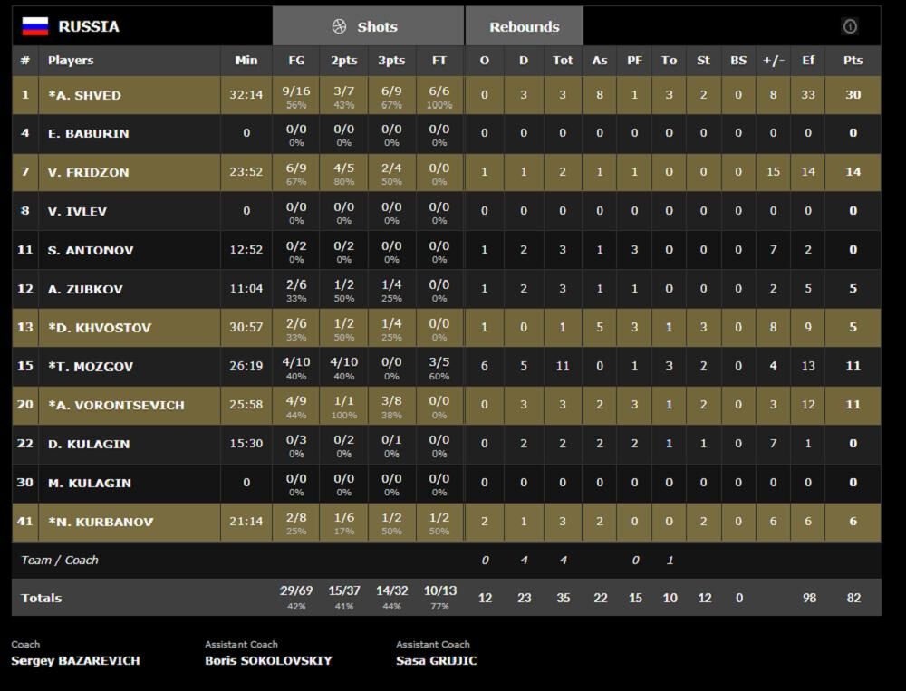 Najbolji u pobedničkom timu bio je Aleksej Šved sa čak 30 poena i 8 asistencija. Istakao se i Fridzon sa 14 poena.