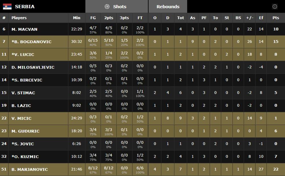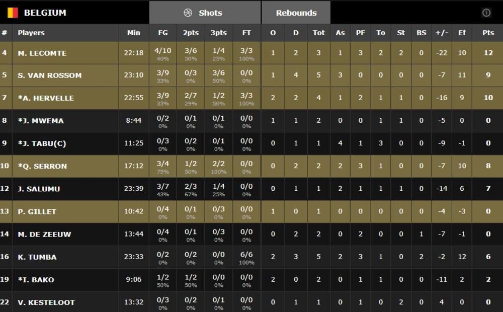 Najefikasniji na meču bio je Marjanović sa 22 poena, Bogdan Bogdanović skupio je 15, dok je kod Belgijanaca najviše koševa Lekomt (12 ).