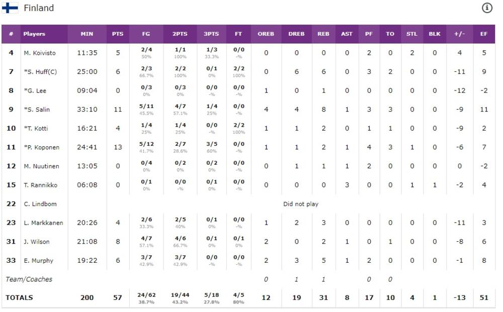 U selekciji Finske 13 poena Koponena, 11 je dodao Sasu Salin, dok je najveća zvezda ove selekcije Lauri Markane zaustavljen na samo četiri poena.