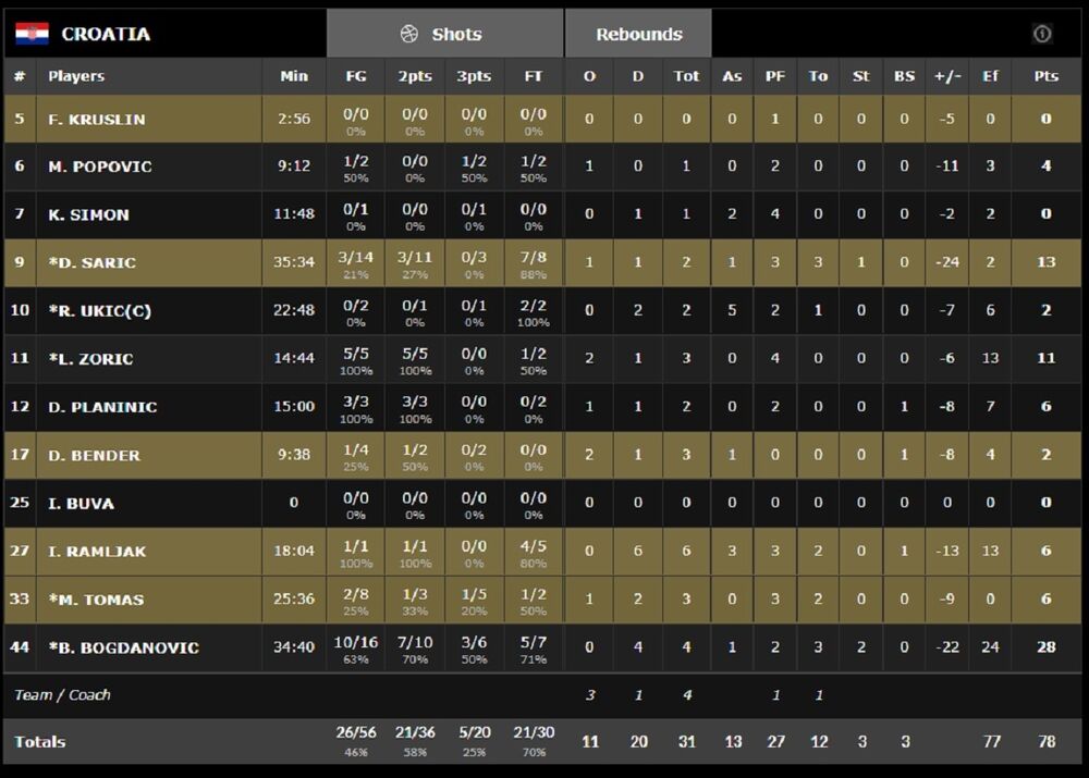 HRVATSKA: Krušlin, Popović 4, Simon, Šarić 13, Ukić 2, Žorić 11, Planinić 6, Bender 2, Buva, Ramljak 6, Tomas 6, Bogdanović 28.