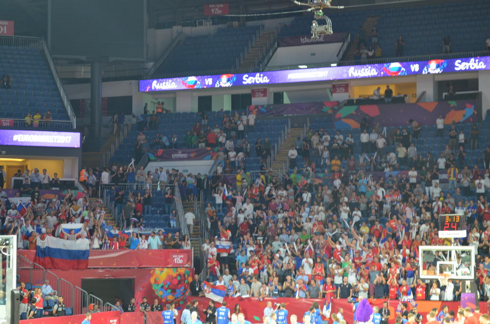3. minut - Skupilo se nešto više navijača u hali, pa ih sada ima oko 4.000. Očekivano, Srbi i Rusi stoje jedni pored drugih i svako navija za svoje.