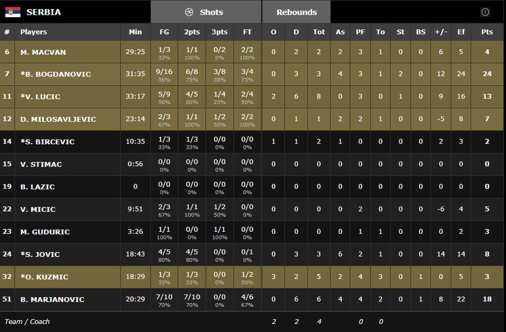Opet u našem timu najefikasniji Bogdan Bogdanović sa 24 poena, a uz njega prvi Marjanović sa 18. Dvocifren je bio i fenomenalni Lučić sa 13 poena.