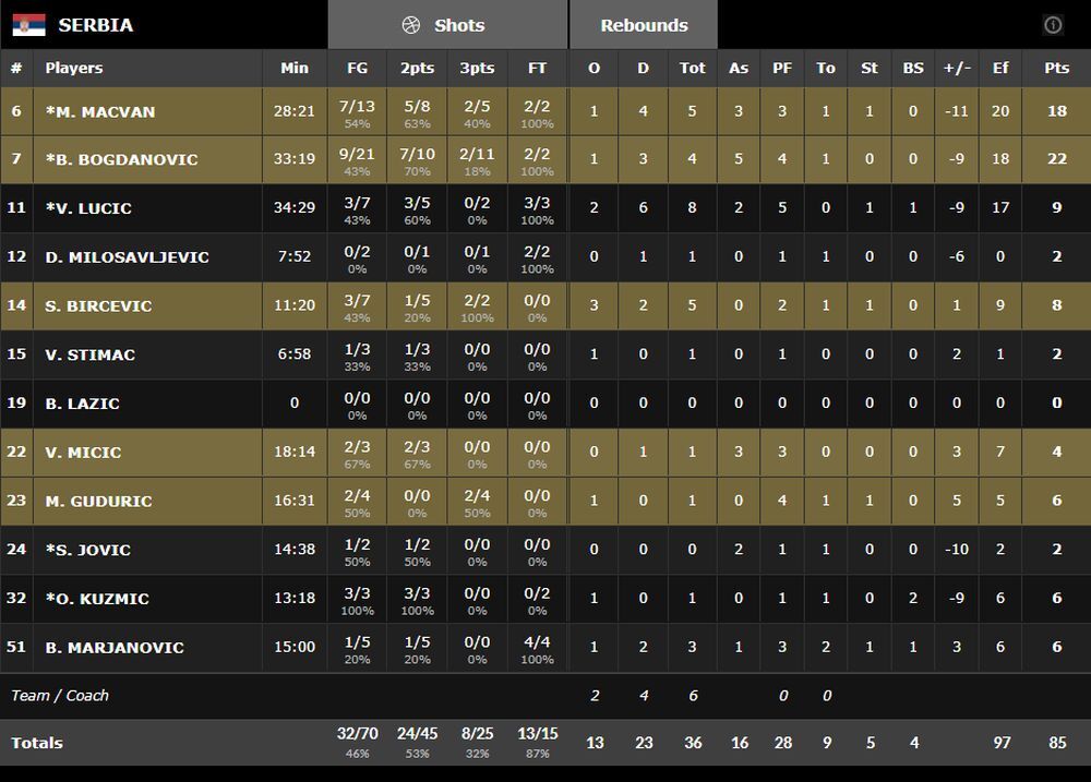 Kod nas po pravilu, Bogdan Bogdanović najefikasniji sa 22 poena, ali uz vrlo loš šut za tri poena 2/11, uz kapitena Milana Mačvana koji je postigao 18, ali su namk podbacili centri, za koje smo očekivali da budu naše oružje.