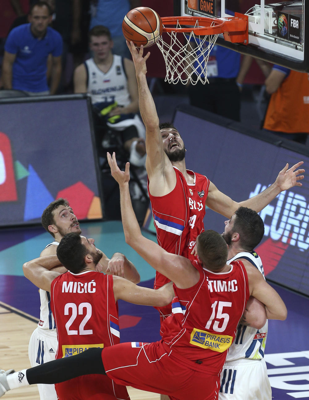 7. minut - Igra se maltene koš za koš. Jasno je da veliku prednost imamo pod obručima kada su u igri Marjanović i Kuzmić, kao i Mačvan, ali Slovenci su za sada izuzetno raznovrsni u napadu. Srbija - Slovenija 16:13.