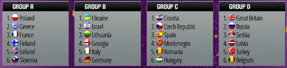 U grupi A će igrati selekcije Poljske, Grčke, Francuske, Finske, Islanda i Slovenije, u grupi B će igrati Ukrajina, Izrael, Litvanija, Gruzija, Italija, Nemačka, a u grupi C Hrvatska, Češka, Španija, Crna Gora, Rumunija, Mađarska.