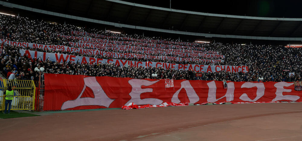 Delije su na meču Lige Evrope podigle šest transparenata, na kojima su bile ispisane godine i lokacije američkih/NATO intervencija po svetu.