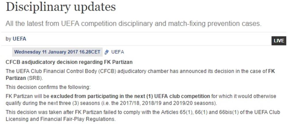 Naime, iz Partizana su dolazile informacije da će novac biti uplaćen, ali se čini da je kasno za tako nešto pošto je UEFA izdala saopštenje na svom zvaničnom sajtu u 16:28 koje potvrđuje da crno-beli neće igrati jednu sezonu u kontinentalnim takmičenjima...