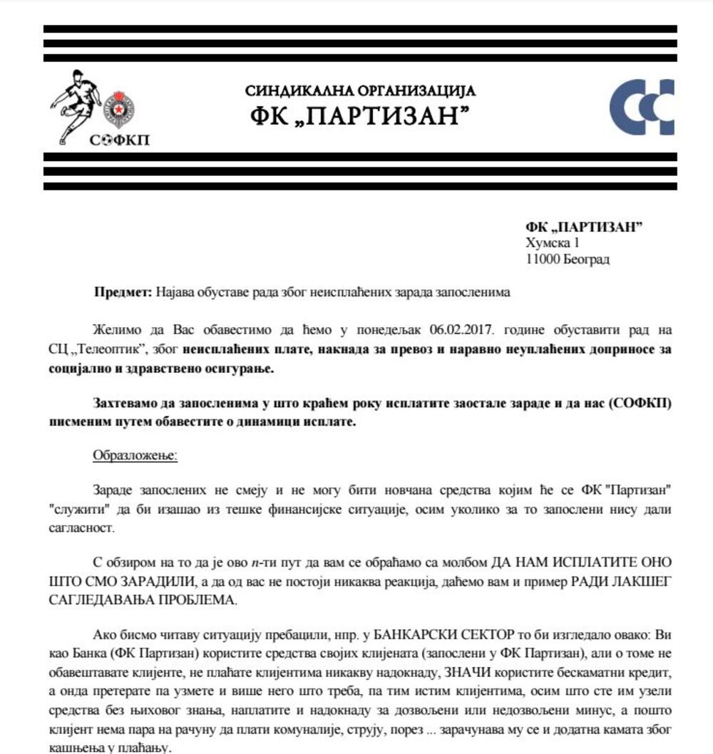 Saopštenje Sindikalne organizacije FK Partizan prenosimo u celosti: