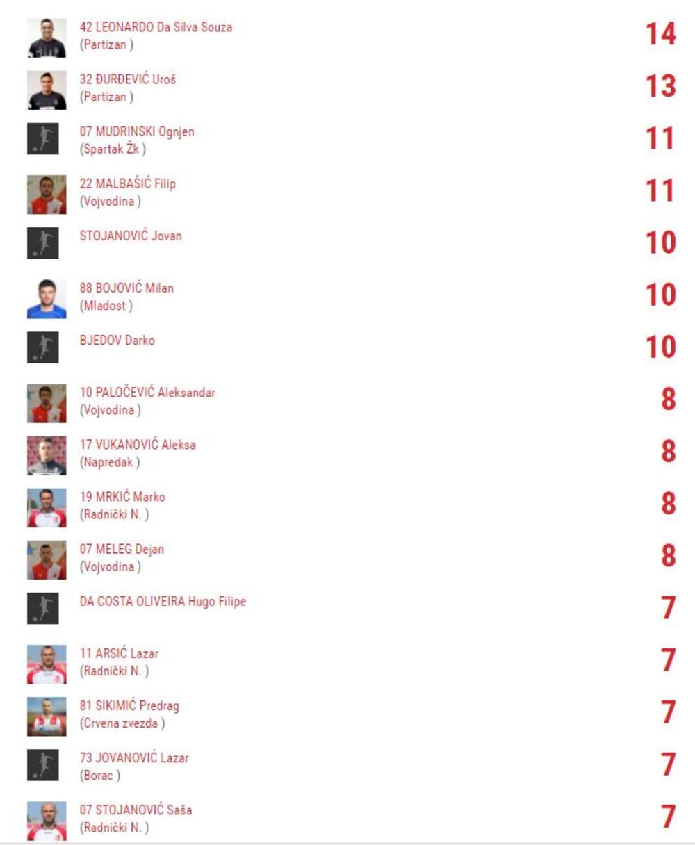 Na čelu ove tabele nalaze se Partizanov dvojac - Leonardo (14 golova) i Uroš Đurđević, dok treće mesto dele Ognjen Mudrinski (Spartak) i Filip Malbašić (Vojvodina).
