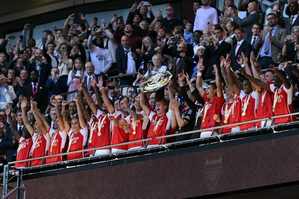 Fudbaleri Arsenala sa trofejem Komjuniti šilda, Foto: JUSTIN TALLIS / AFP / Profimedia