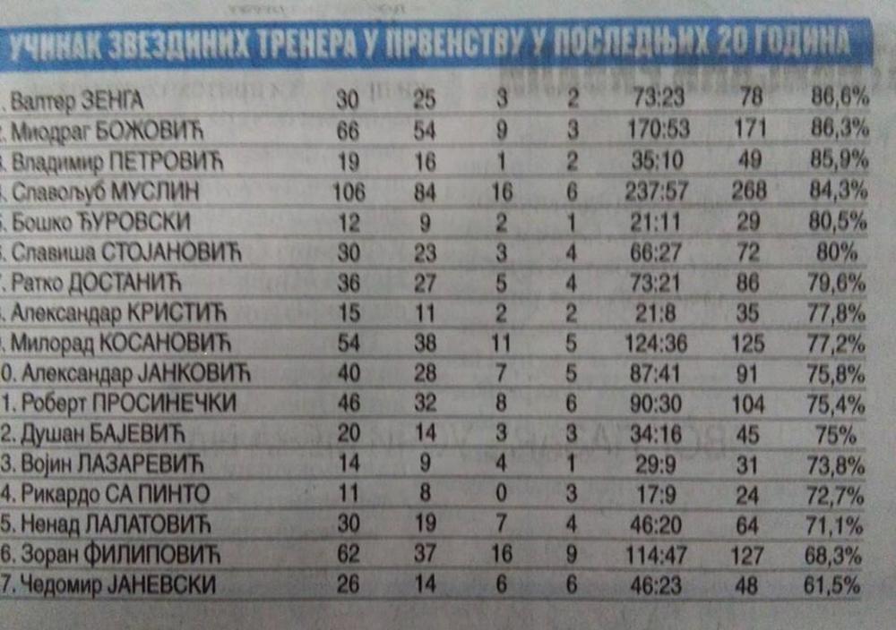 Slede Vladimir Petrović Pižon sa 85.9 i Slavoljub Muslin sa 84.3, uz veoma važnu napomenu da je sadašnji selektor Srbije bio na klupi na preko 100 utakmica, i da ima magičnu gol razliku. U proseku je primao pogodak na svakoj drugoj.