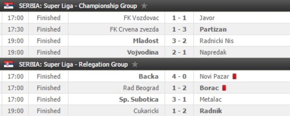 Na poslednjem mestu sada je Novi Pazar, koji je izgubio 4:0 od Bačke u gostima. Pazarci su od petog minuta igrali bez Aleksandra Tasića, koji je dobio direktni crveni karton.