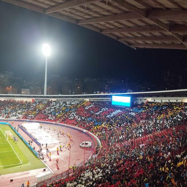 Prikazane su crvena, bela i žuta boja, a na severnoj tribini istaknuta je i sledeća poruka: